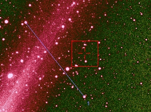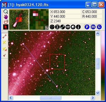 This screen-shot shows an 8-bit intensity image displayed in Mira. A pseudo-color palette was applied to the image. Notice the image cursor as a red square with crosshair at its center.