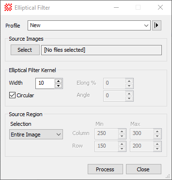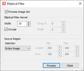 The Elliptical Filter applies an equal weight elliptical filter to an image. The filter may have circular symmetry or be elongated and rotated. The Gaussian Filter is similar in these regards but uses Gaussian weights rather than equal weights. The Rectangle Filter is similar but has uniform weights over a rectangle rather than an ellipse.