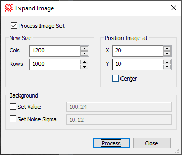 The Expand Image command enlarges the image by extending the image border to a larger area. The result is the original image data Imbedded in a background of uniform intensity. This command is usually used before Imbedding images into the background.