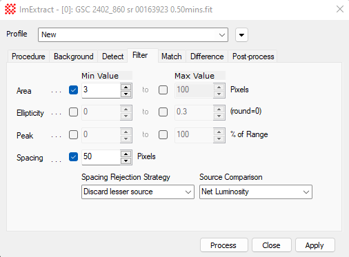 The Filter page of the Source Extraction Properties set inclusion limits on basic source properties measured by the Extract Sources command. After objects are detected, their properties are computed. Values set in this dialog are used to filter out objects that do not fall inside the selected limits. For example, settingArea Min = 2 assures that sources having a single pixel are not includes in the final tabulation of source data. Conversely, if you only want to detect single pixels, uncheck Area Min and set Area Max = 2. Only items that are checked are used.