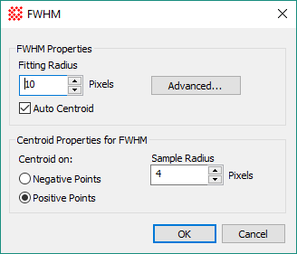 This dialog sets Properties for the Precision FWHM measurement. This measurement is one of the Post-process options for the Extract Sources command.
