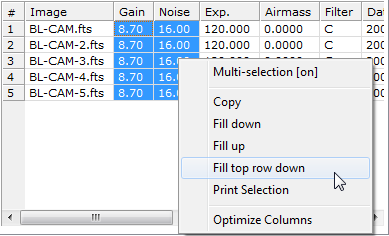 Changing values in the image information table is simply a matter of clicking on a cell and typing new numbers into the target cell. Additional tools are provided in a pop-up menu that is opened by right-clicking on the table. The menu provides the ability to copy or save data from the table. In addition, if working with an image set, the menu provides tools for copying specific cells to other cells of the table.