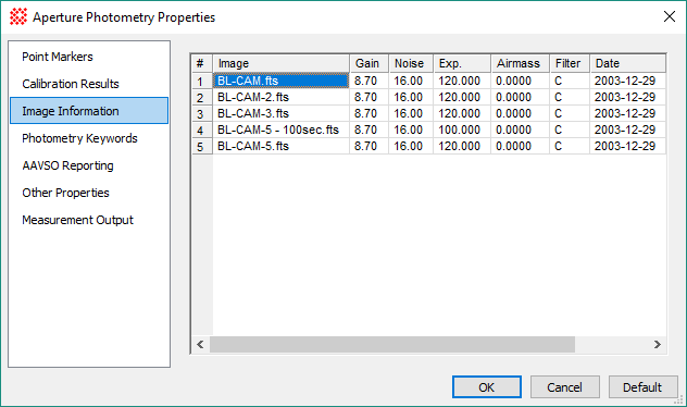 The Image Information page is a member of the Aperture Photometry Properties dialog. This page shows a table containing the instrumental Properties used in the photometric calculations as obtained from the image headers. The table has one row per image listing the image name, camera gain, readout noise, exposure time, and other properties determined from the image header. The table columns can be resized by dragging the vertical separator bars between the column headings.