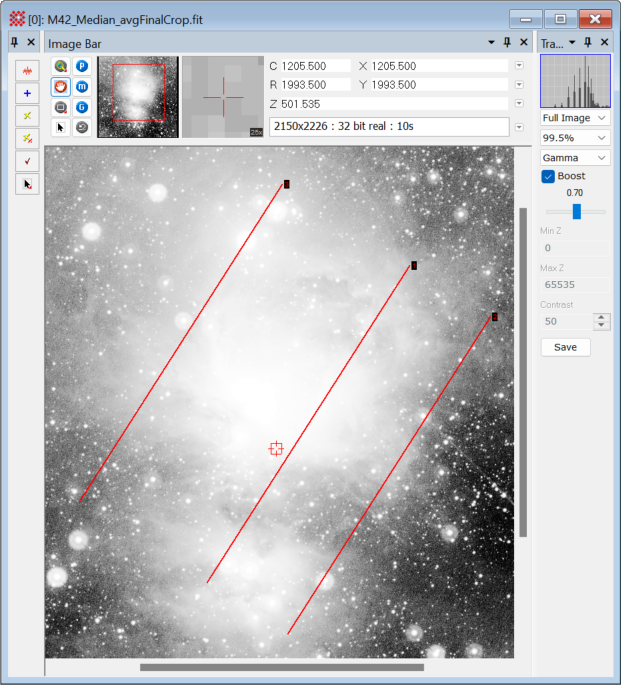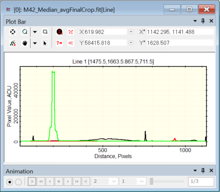 The line profile is drawn into a Plot Window like that shown below. Notice that the horizontal axis is distance, not an absolute position as used in Column Profile and Row Profile plots. The Plot Window below shows multiple parallel profiles on the head of a comet. These were made by switching to toolbar Move mode and repeatedly dropping the profile line further along the long axis of the comet head. The spike was caused by the profile line crossing a star.