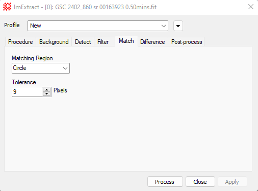 The Match page of the Source Extraction configures source list matching for the Extract Sources command. When extracting from an image set, source list matching removes sources that pass all the filtering criteria but are not located at the same coordinate in every image of the image set. In other words, this phase produces a final source list that includes only those objects that match in every image. Only the coordinate is used as a matching criterion and source differences such as intensity or shape are not involved. The Tolerance and Matching Region properties control the area searched to establish a coordinate match at each object location. Depending upon the application, you may or may not need to register the images before using source matching.