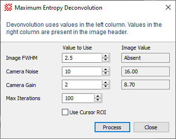 For best results, the Properties must be chosen carefully. Mira's implementation of Maximum Entropy processing uses 3 Properties: FWHM, Camera Noise, and Camera Gain. The dialog shows two sets of Properties:
