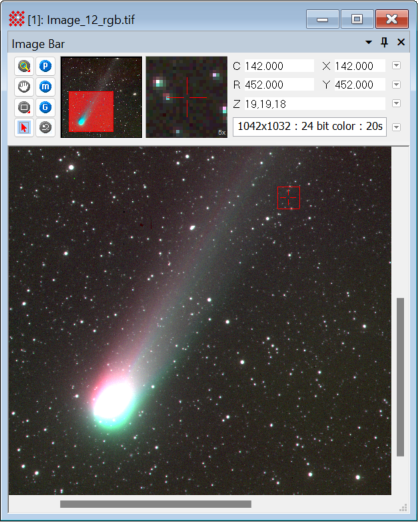 RGB Merging is useful for data visualization tasks beyond simply creating a color image from filtered monochrome images. This example illustrates how motion of Comet Hyakutake (Comet C/1996 B2) may be quickly visualized by merging 3 exposures acquired at different times. After loading the Hyakutake sample images provided with the Mira installation (see the Image Window above), the first, middle, and last images were selected as the R, G, and B channels. The names of these files represent a time sequence, so images 120, 135, and 145 were chosen to mark the beginning, middle, and end of the exposure sequence. Mira calculates the default black and white levels when an image is selected, so no other adjustments were made. In the merged RGB image below, notice how the first (red) image shows the beginning position while the last (blue) image shows the final position of motion relative to the stars. Note that the color of the R and B channel images is shifted toward green by the overlapping middle image used for the G channel.