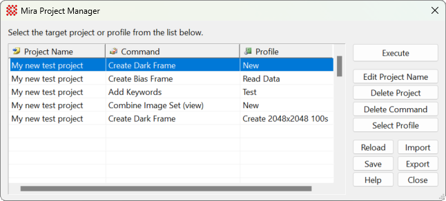 The Mira Project Manager shows all "Batch Projects" plus their commands and parameter profiles. Use this window to edit and execute batch projects. The piture below shows one project named "My new test project" opened. If more than one project has been saved, all projects will be opened in this window. Initially, many of the buttons are grayed out. This persists until you click on a project to select it.