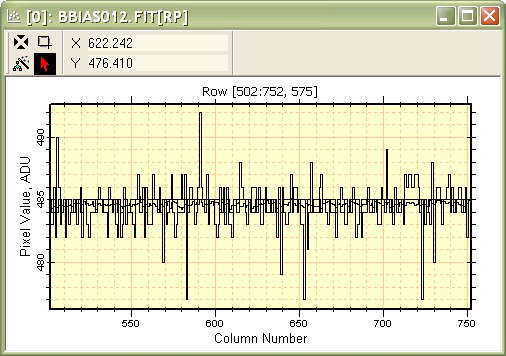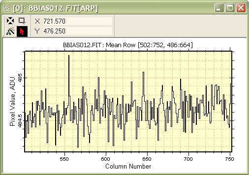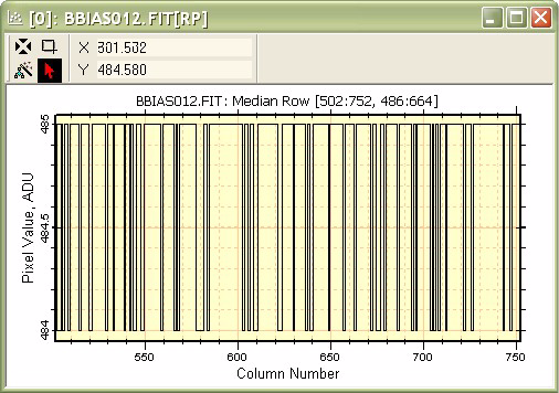 Next, the Combine Mode was changed to Median using the Plot menu command. The resulting median row plot is shown in the window. Notice that the median row jumps between integral pixel values, which is as would be expected for an image of almost pure noise.