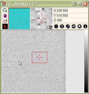 The figure below shows the image that will be plotted. This is a CCD Bias Frame which shows primarily random noise. The region of interest is defined by the position and extent of the rectangle cursor.