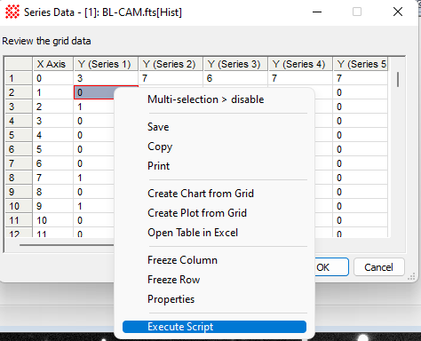 Use the Plot Series Data command displays the data for all plot series owned by a Plot window The data are tabulated along with the x axis value in the Series Data dialog. The data may be inspected, saved to a file, copied to the clipboard, graphed, or you may execute a script on the data. Since this window contains a Grid Control, you can do script-based analysis of its data using the Execute Script command in its pop-up menu. See the Script Execution topic under Grid Controls.