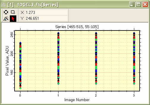 The following plot shows a Pixel Series Plot. This graph shows points at the same location vary among different images of an image set. The points from a given image all have the same color.