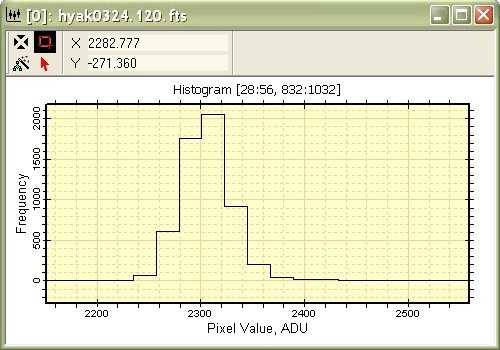 The next plot shows a histogram of pixel values inside a rectangular region of the image.