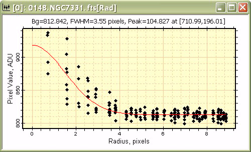 The following plot shows a Radial Profile plot with the FWHM value calculated from a fit to a point in the image data.