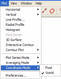 Plots can be created with their positional axis in Pixel Coordinates or World Coordinates. The selection is made using the World Coordinates Option, which can be changed from a number of places in Mira.