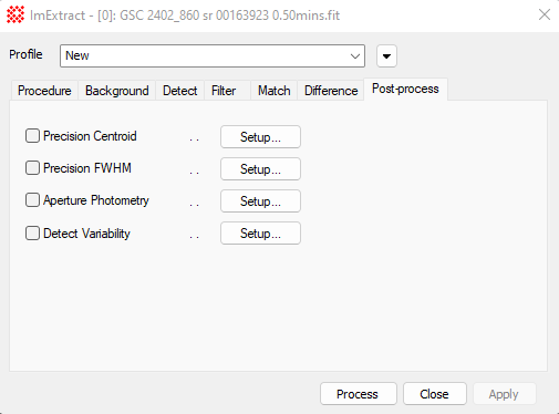 The Post-process page of the Source Extraction Properties configures precision measurements made by the Extract Sources command. These measurements are made after the Detection and Filtering phases are completed.