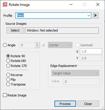 The Rotate Image command can rotate an image or image set in 90 degree steps, perform mirror flips, transpose about the main diagonal, and apply free rotation using any precise angle. You also can rotate an image by an angle using the button on the Image Bar.