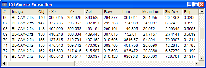 The Procedure lists several Reporting options that control what happens to the extracted properties. If you want only to show markers for detected objects, you can choose the No Report option. Otherwise, you can save the properties to a Report window or to a text file. If the List to Report Window option is bulleted, the data will be listed to a window like this: