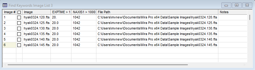 The pictures below show the result of using the profile settings in the dialog at the top of the page to find EXPTIME and NAXIS1 keywords from images in a folder. The first Report Window shows the result with Require matching all keywords unchecked. In this case, any keyword that satisfies its comparison allows the image to be listed in the Report Window. Then checkboxes in the Report Window may be used to select images for further use, for example, displaying or saving to a File List.