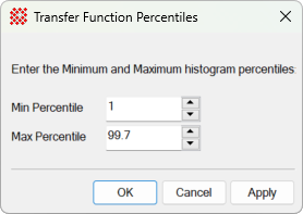 Figure 2. Min % and Max % are the minimum and maximum pixel value percentages for the transfer function. To compute the corresponding pixel values, the image histogram must first be computed. These values are determined from the histogram inside the transfer function sample region selected using the Sample menu options. The values 0 and 100 correspond to the Min Z and Max Z values in Figure 1.