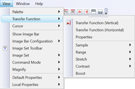 Transfer Function settings can be changed from popup windows similar to the way they are changed using the Transfer Function Pane and Transfer Function Properties dialog. One of the menus is shown below. All of the properties in this menu tree are described under Transfer Function Definition. All of the menu commands may be set using the horizontal or vertical transfer function panes.