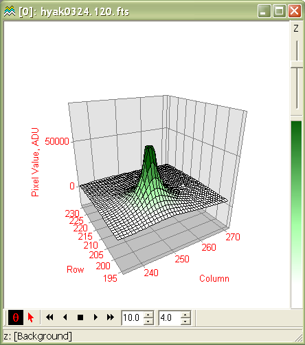 Mira can quickly create a 3-D Surface Plot showing the surface intensity versus (column,row) position in the image. Like contour plots, 3-D plots work with the region bounded by the Image Cursor and should be constrained to a small number of pixels, usually not more than 10,000 pixels in area unless the image is very noise-free. Otherwise, plotting many pixels often just shows a rough noise surface with little information. Various types of 3-D plots are available; see 3-D Pixel Representations to view some of these variations.