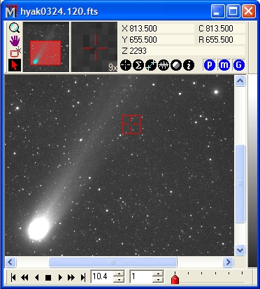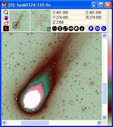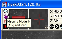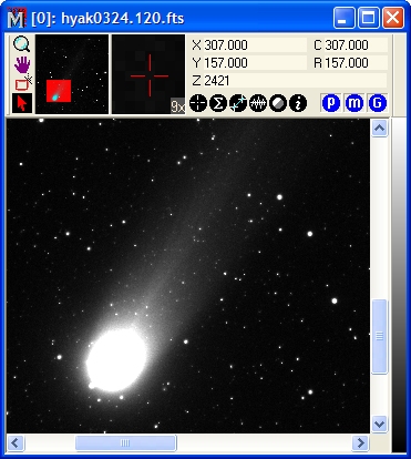 In the Open dialog, click on 'hyak0324.120.fts' to select it as shown, then click [Open]. An image is opened into an Image Window that looks like the one shown below. Note that the image appears small because it was scaled to fit the screen.