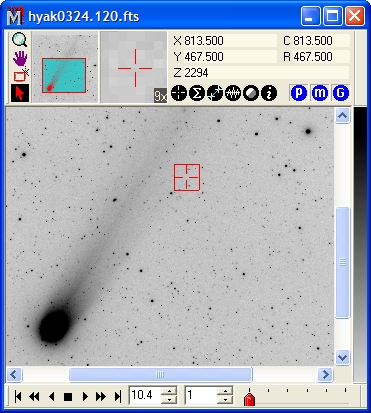 Along the top of the Image Window is a command center called the Image Bar. Two live parts of the Image Bar are the two auxiliary image views and the Image Coordinate Display section. The auxiliary views show a thumbnail that indicates the currently visible region and a magnified view that tracks the mouse pointer. The Coordinate Display section also tracks the mouse pointer, displaying both column and row position in the image (C and R) as well as the pixel value Z, and the World Coordinates X, and Y. World Coordinates refers to Right Ascension and Declination. This image has no World Coordinate System (WCS) calibration so (X,Y) equals (C,R).