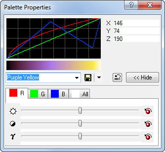 On the right border of each image window is a vertical bar of Grayscale or color, called the Color Map, or "Color Map" which is a hot area that takes action upon mouse dragging, double clicking, and right double clicking. Now, double click on the Color Map to open the Palette Properties dialog. Underneath the palette graph is a drop box containing the names of different palettes:
