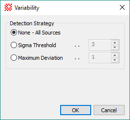 Only sources meeting the variability criteria given below are tabulated in the Messages window.