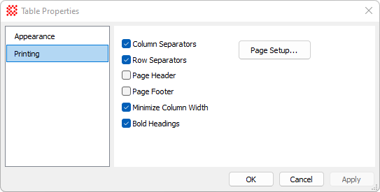 Table Printing Properties