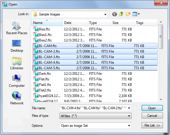 open an image set for the BL-CAM*.fts sample images provided with the Mira
