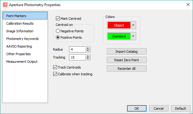 The Aperture Photometry Properties dialog is used to configure the aperture Photometry command. Specific Property pages organize similar commands or procedures.