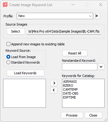 Select where the keywords are obtained: Load from Image scans all target images to collect keywords from all headers. Standard Keywords lists the set of keywords recognized by Mira. |
