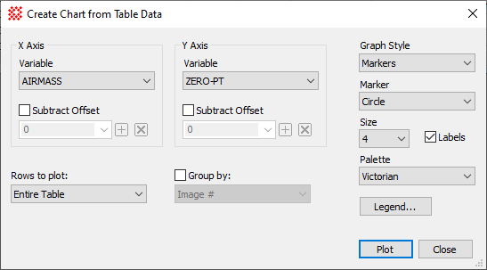 The Create Chart from Grid command in the menu is used for graphing the photometric zero point (ZERO-PT keyword) against the airmass of the observation (AIRMASS keyword). The two pictures below show the Create Chart from Grid dialog and the chart (graph) created by clicking [Plot] on the dialog. In this example, notice that only 2 points appear in the chart because only two of the images have values for both keywords.