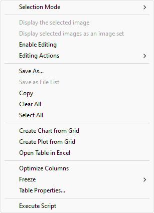 After images are listed in the Report Window, a substantial collection of graphing and other tools are available for analysis. Some of these tools are available as commands in the pull-down menus for the Report Window, while others are accessed by right clicking on the grid to open its Grid Context Menu like that shown below. In addition, you can work with data in the Report Window from scripts using the CGridView script class.