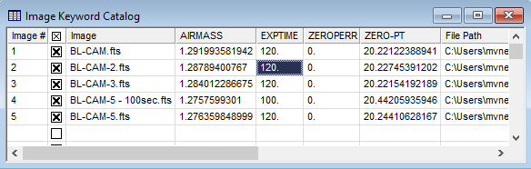 The Create Image Keyword List command generates a table of keyword values for a collection of images and lists them in the Image Keyword Catalog Report Window where they may be viewed, graphed, saved to a file, and otherwise processed (see Report Windows for details). For example, several images may be selected from the list and displayed in a new Image Window, saved to a Mira File List for later processing, or graphed as one keyword versus another keyword.