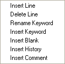 Inserts a keyword from those that Mira knows. Procedure: Position the cursor where you want to insert a new keyword line and right click to open the Context Menu. Choose Insert Keyword to open the list box of known keywords. Select a new keyword. Mira inserts the keyword name into the Keyword cell and moves the cursor to its Value cell. To edit the value cell |