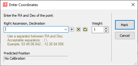 This dialog opens automatically after you click on a point that has not been previously marked. The only information must specify is the right ascension and declination of the point, but you can also change the weight of the point if you want it to have more or less influence than the other calibration points. The two buttons on the right side allow you to accept or discard the point being marked: