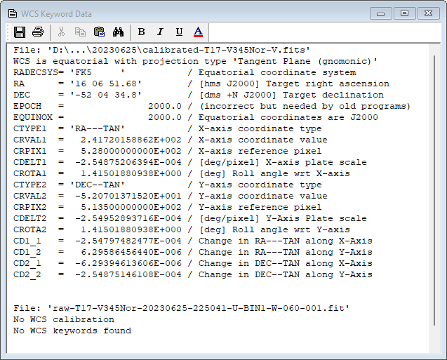 The example below lists WCS keywords from a fully calibrated image header. Note that the ".txt" extension is automatically appended to the window title after the contents were saved to a file.