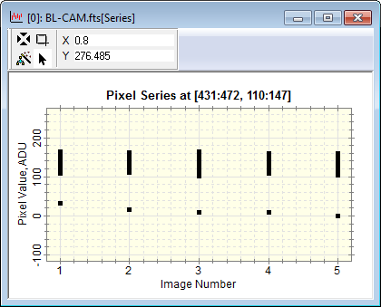 The window below shows a Pixel Series for 2,601 pixels in 4 images. The Image Cursor was a 51x51 pixel rectangle, thus outlining 2,601 pixels in each image.
