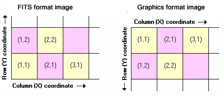Pixel number in any direction starts at pixel number 1. This means that the first column is labeled "column 1" and the first row is labeled "row 1". The first pixel of a 2-dimensional image is therefore labeled "pixel 1,1". As a result the maximum pixel number in any direction is equal to the number of pixels in that direction. For example, an image having 1000 columns runs from column 1 to column 1000. Traditionally, graphics file formats have started at pixel 0, which means that a 1000 column image runs from column 0 through column 999. However, this is a convention in the graphics community and not an enforced standard. Thus, to keep everything uniform inside Mira , all images use the FITS definition so that an image axis with n elements (pixels) runs from pixel 1 through pixel n, inclusive.