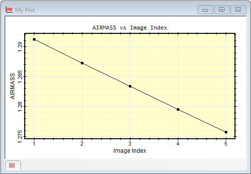 The script below created the plot window shown above. The CImageView V was selected from a drop-list of all open image windows, and an image set was chosen. The header keyword AIRMASS was chosen for the x-axis. You could choose any keyword in the headers, or plot against some other value.
