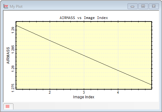The plot above was created using the script below. The CImageView V was selected from a drop-list of all open image windows, and an image set was chosen. The header keyword AIRMASS was chosen for the x-axis. You could choose any keyword in the headers, or plot against some other value.