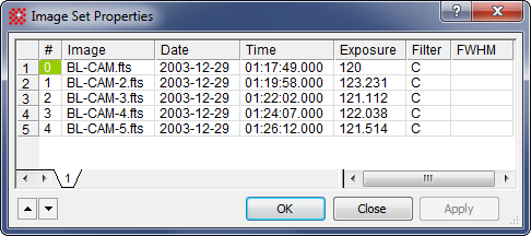 The Image Set Properties command opens a dialog containing a table of selected properties for images of an Image Set. You can also re-order the image set by sorting on the properties or by manually interchanging the image ordering. The changed order can then be saved to the Image Window. The re-ordering capability of this command is also available using the Image Set Toolbar (Ctrl+Q).