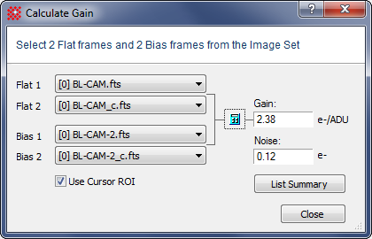 The Calculate Gain command measures the inverse electronic gain of a digital camera. The gain is expressed in terms of either electrons per Analog to Digital Unit (ADU) or Digital Number (DN), as "e-/ADU". Detailed results of the calculation may be listed in the Message Pane.