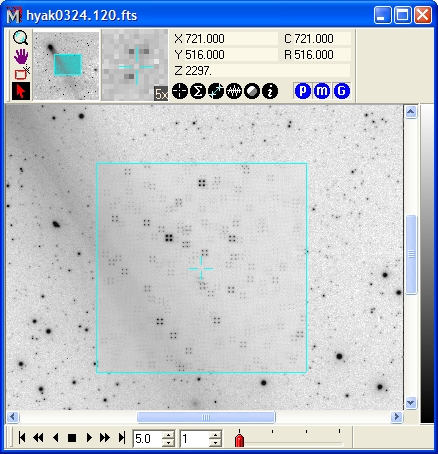 After executing the script, the Mira Image Window might look like the one below. You can see that the Image Cursor was moved to outline the central 20% of the image that was filtered.