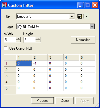 The Custom Filter command convolves a user-specified filter kernel with an Image Set or a single image. The filter kernel may be any size you specify and a given kernel may also be normalized to a "volume" of 1.0 without typing in normalized weights. The kernel description can be saved as a profile and reloaded when needed