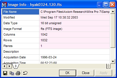 This command is available for both RGB and non RGB images. For FITS format images, it shows only a small portion of what is usually present in the FITS image header (see FITS Header Dialog). |