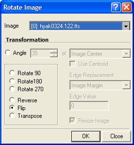 The Rotate Image command can rotate an image or image set in 90 degree steps, perform mirror flips, transpose about the main diagonal, and apply free rotation using any precise angle.